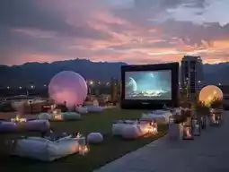 黄昏时分,踏上这片草坪,首先映入眼帘的是巨大的露天电影屏幕。与传统影院不同,这里没有固定座位;取而代之的是色彩缤纷的沙袋沙发,邀请你随心所欲地躺卧,享受极致的舒适。