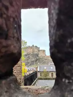 在爱丁堡城堡对面的山脊上,我发现了一处仿佛秘密宝地般的景色——城堡傲然耸立于天际,被风化的石墙完美地框住。透过石墙上的一个小孔,城堡宛如一幅画卷:炮塔、城垛和旗帜都被巧妙地框入这天然的画框之中。