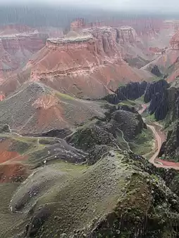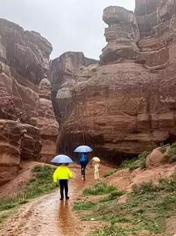 踏入雨后的哈伦峡谷,仿佛置身于一幅朦胧的水墨画中。细密的雨丝如同银线,织成一层朦胧的面纱,轻轻地覆盖在绯红的岩壁上。岩石仿佛苏醒过来,色彩更加浓郁深邃。