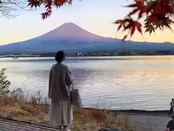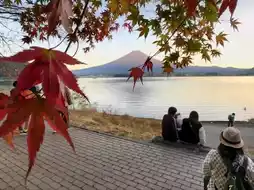 🌈日间限定:层层叠叠的橙红色和赭黄色枫叶在阳光下闪闪发光✨ 远处,碧蓝的河口湖与富士山的完美倒影,营造出浓郁的日式风情!