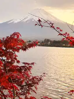 我们傍晚抵达河口湖,透过清澈的湖面,可以看到远处富士山的红色枫叶。