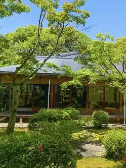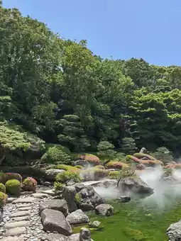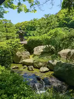 沿着石径漫步,映入眼帘的是横跨锦鲤池塘的优雅桥梁,水面波光粼粼,倒映着锦鲤的身影。潺潺的瀑布声和树叶的沙沙声营造出舒缓的氛围,更增添了庭园的静谧之美。每转一个弯,都会发现新的景致——修剪整齐的盆景、精致的茶室和摆放得恰到好处的石灯笼。