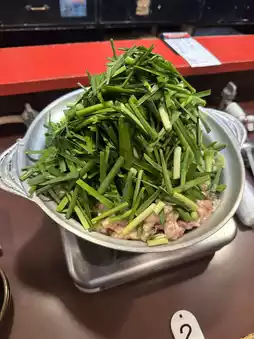💞推荐理由:来福冈一定要尝尝这道当地特色美食——牛大肠火锅。火锅里有鲜嫩的牛大肠和各种蔬菜,上面还铺满了韭菜。这种特色牛大肠火锅或许不是你的菜,但来福冈一定要尝尝。