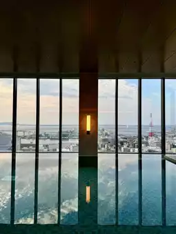 酒店外观比较低调,与周围环境融为一体。入口并不显眼,但当你踏入酒店,身后的厚重自动门缓缓关闭时,仿佛瞬间与世隔绝。映入眼帘的是一个层次丰富的空间,光影交错,低调而富有质感。后来我了解到,这家酒店的设计灵感源自福冈的传统工艺“编织”。室内装潢以实木为主,融合了日式简约与现代都市气息,在喧嚣的都市中营造出一片静谧空间,让人一踏入便能放松身心。