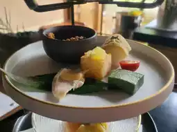 随后,一个三层茶点托盘呈现在客人面前。顶层摆放着九种甜点,中间层呈现五种咸点,底层则是搭配甜豆沙的时令水果。服务员会详细讲解菜单,菜单提供英文和日文两种版本,方便客人选择。咸点创意十足,甜点则精致优雅。
