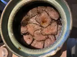 ——到达由布釜饭(一家连锁餐厅)后,我们立刻开始排队。上午10:45到达,只等了15分钟就进去了。这家餐厅名不虚传;鸡肉碎和丰后牛肉都有浓郁的炭烤香味,非常美味。配菜非常诱人,酱料种类也很多。主菜搭配酱料味道更佳。——