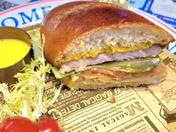 (超大猪扒,鲜嫩滑嫩,搭配生菜、番茄、酸黄瓜和芝士酱,味道尤其鲜美;面包趁热酥脆,更是美味无比。)
