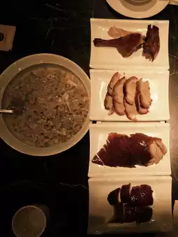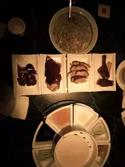 整只北京烤鸭的摆盘就像宫廷宴席一样。