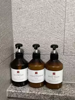 里有杯子、香皂、洗发水、护发素和沐浴露