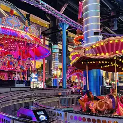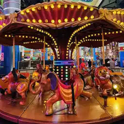 并非所有主题公园的游乐设施都需要规模庞大才能带来乐趣。“Ride 'Em Round”区域是一个迷你旋转木马,上面装饰着各种奇趣的动物角色——非常适合孩子们,而且拍照也超级可爱。灯光、齿轮、欢快的音乐——这一切都营造出一个充满欢乐的小世界。