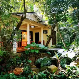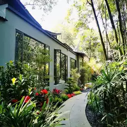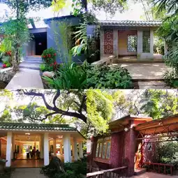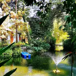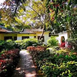 绿树成荫,遮天蔽日;蜿蜒曲折的亚热带植物;水边琉璃瓦铺就的“无锚之舟”;静谧祥和的“镜亭”;竹篱笆、茅草屋,幽深幽静的绿径,精致典雅。