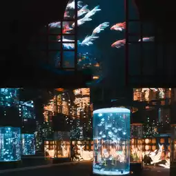 千万别错过1号展馆的圆柱形鱼缸。站在旁边,可以轻松拍出被鱼群环绕的美丽剪影。