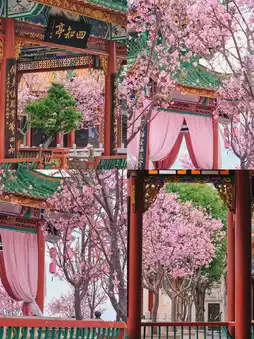 南岳园距离宝沫园只有几分钟的步行路程。这里也是一片樱花海,但游客明显较少,非常适合想要安静拍照的人。园内的樱花遍布各个角落,无论是亭台楼阁旁,还是桥巷之间,都能找到绝佳的拍摄角度,出镜率超高📸