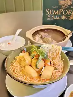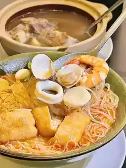 酸辣汤底鲜美无比!虾、鱿鱼、鱼片堆成小山,汤里加入花生酱和椰奶,米粉汤汁饱满,鲜香可口,是夏日开胃菜的绝佳选择!