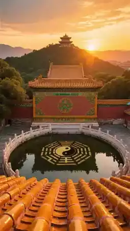下山途中,参观了黄龙古庙(包含在通票内)。这座唐代道观依山而建,红墙绿瓦掩映在苍翠的松林之中。最令人叹为观止的是庙后的琉璃屏风和八卦池。夕阳西下,金色的光芒洒在琉璃瓦上,整座宫殿宛如燃烧的火焰,美得令人窒息。