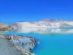 湖水宛如蒂芙尼蓝丝绸般晶莹剔透!白沙山倒映在湖面上,美不胜收,下午顺光拍摄效果最佳,湖面更加清澈。