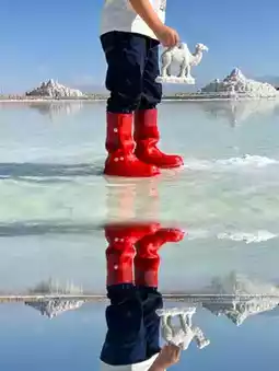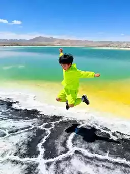 乘坐小火车直达5号站,节省体力,和孩子们一起解锁“地球钢琴”签到点,踩在黑白盐晶图案上拍照~收集任务卡,收集蓝色、绿色和黄色的湖景,兑换翡翠兔冰箱贴,孩子们在玩耍中学习颜色!记得穿高筒雨靴防海水,下午2点以后湖水颜色最鲜艳,穿上荧光色的衣服拍照更吸睛🌟 黄昏时分在湖边野餐,享用牦牛肉干和青稞糕,孩子们收集盐晶,像“钻石”一样装满小瓶子。