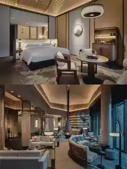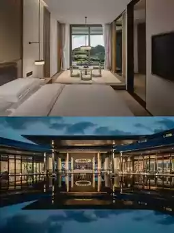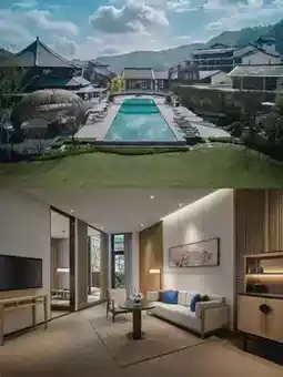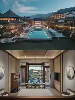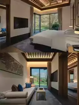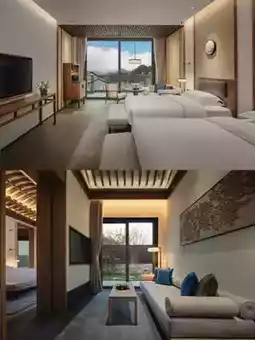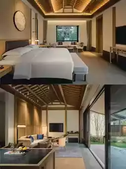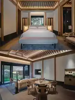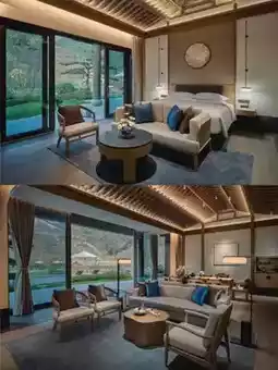 酒店拥有160间客房和别墅,均配备观景阳台或独立庭院,您可以躺在上面欣赏天目山的壮丽景色。粗麻布墙布和泰式藤编灯具的天然质感,细节之处尽显设计的匠心独运和东南亚的独特风情。