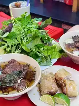 来河内一定要尝尝烤肉米粉!浓郁的烤肉香气扑鼻而来,搭配鱼露汤底、香草和米粉,层次丰富的口感令人回味无穷!别忘了搭配炸春卷,外酥里嫩,超级满足!💯