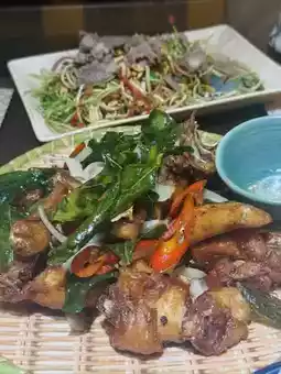 这家复古风餐厅的脆皮炸鸡🍗炸得恰到好处,外酥里嫩,撒上香叶和辣椒,配米饭简直绝配!木瓜牛肉沙拉🥗酸辣爽口,非常开胃!