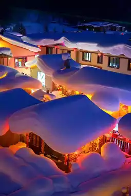 傍晚,我们到达了雪乡,周围环绕着蘑菇状的房屋。夜景美得如梦似幻。