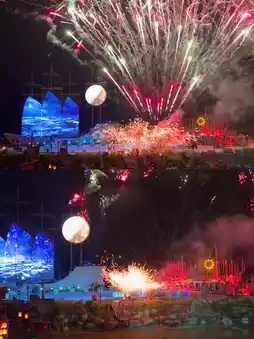 沉浸式全景表演《水火之歌》通过烟火特效讲述海上丝绸之路的故事,展现古代港口生活。