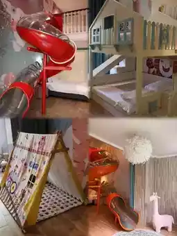 有很多房型🏠,包括复式房和带梦幻滑梯的房间,