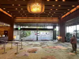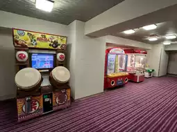 一楼大堂内有一条小河,与外面的池塘相连,您可以在室内喂鲤鱼。旁边就是商店街,出售各种纪念品和饮品。