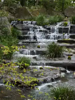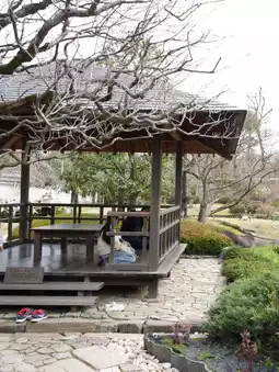 这是一座日式庭园,园内设有池塘,采用漫步式布局,利用考古发掘中发现的武士居所及其他建筑遗迹建造而成。
