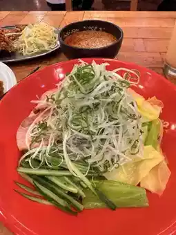 冰凉的面条上铺着焯过的凉拌卷心菜、堆成小山的黄瓜丝、葱丝、烤猪肉和半熟蛋。最特别的是蘸酱,是用酱油、醋、芝麻和特制酱汁调配而成。每一口都充满浓郁的芝麻香气。因为蔬菜很多,所以吃起来既饱腹又不会有负担。