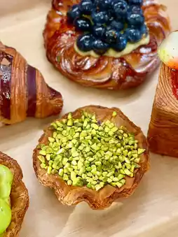 这款双层开心果酥皮挞口感酥脆,内馅满满都是开心果碎和开心果酱。它口感丰富,层次分明,是开心果爱好者的必点之选。💜