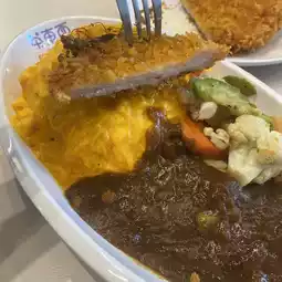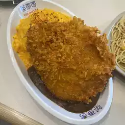 推荐💟 超大块😍比我的手掌还大🖐️ 热乎乎的,一口咬下去松软可口,外酥里嫩,肉汁浓郁👍🏻 嫩滑的半熟炒蛋盖在白米饭上,淋上甜咖喱,真的很好吃,而且很饱腹🤗