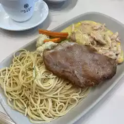 一大块加拿大炸猪肉,煎至香味四溢,猪肉鲜嫩多汁,一点也不嚼不动,搭配玉米、火腿和鸡肉条,味道很棒,意面也很有嚼劲👍🏻