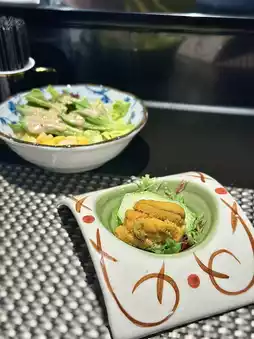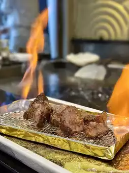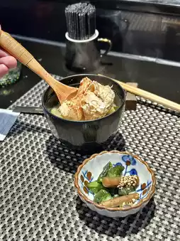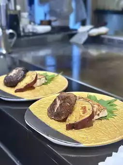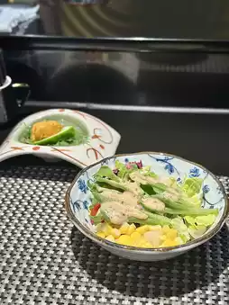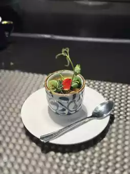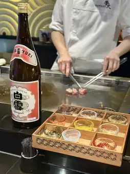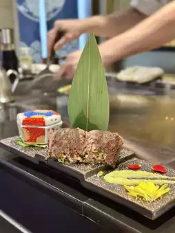 我们四个人,点了两份,分别是龙虾和培根,每份1190元!晚餐铁板烧可以免费畅饮清酒两小时(午餐铁板烧是1.5小时),还送海苔杯🤤 先上清酒和海苔杯,然后吃黑鱼子酱鹅肝蒸蛋,这才是铁板烧的真正开始!