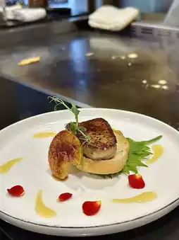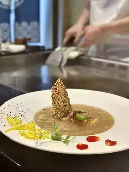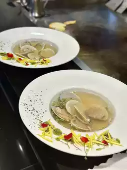焦糖鹅肝吐司的焦糖味恰到好处,鹅肝香气浓郁,却不油腻。师傅教大家最后可以挤一点青柠汁~ 感觉更清爽!酱汁煮白鱿鱼摆盘精美,中间塞着酥脆的鱼皮,就像鱿鱼漂浮在水面上🐠 鱼肉鲜嫩,和葱汤搭配起来味道很棒!