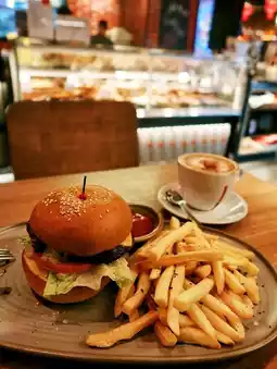 🍔和牛芝士汉堡配薯条(港币148元):多汁的和牛汉堡肉饼与切达芝士完美融合,散发出洋葱培根酱和自家烘焙焦糖的淡淡甜香,咸甜交织,风味独特。中等粗细的薯条外酥里嫩,令整体口感饱满浓郁。