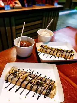 🍫迪拜脆皮巧克力开心果法式可丽饼(港币58元):一款人气新品,手工制作的甜可丽饼,口感柔软有嚼劲,搭配粗粒开心果,加一勺冰淇淋另加港币20元。📍