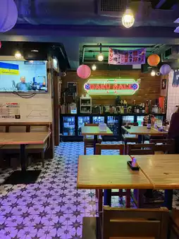*乐九昌*位于尖沙咀,是一家高端日式居酒屋🏮。墙壁和天花板都装饰着日式灯笼和霓虹灯管,充满了浓郁的日式风情🎏。您可以选择榻榻米或普通座位。店内播放着日本歌曲🎶🎵。必点菜品包括:刺身、烤肉、串烧、火锅等等。搭配特调烧酒或自制饮品,更是绝佳享受。夜晚氛围超棒🍺。