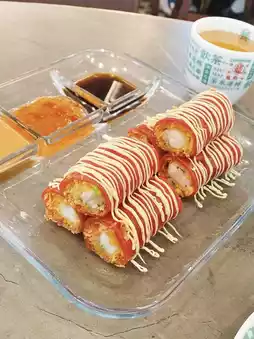 这款炸饭团是速食炸饭团。红色的炸饭团皮非常特别。里面炸得非常酥脆,上面淋着沙拉酱。吃起来一点也不油腻。🔸