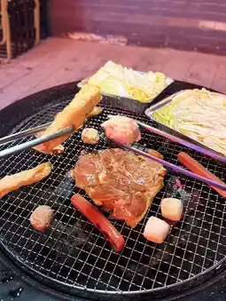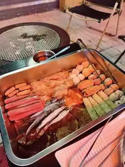那天天气有点凉,我们选了户外烧烤,感觉很合适,炉子旁边暖暖的😆。看到满满一大盘食物,真是惊喜!😍食材种类丰富,包括牛肉、猪肉、鸡排、章鱼、猪颈肉、香肠、鸡翅、各种丸子、豆腐鱼卷等等,还有玉瓜、金针菇、玉米、卷心菜等蔬菜。肉都腌制入味,味道超赞!