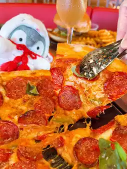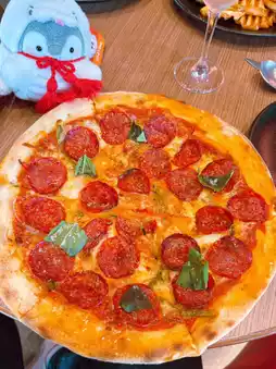 主菜点了意式手工香肠披萨和和牛芝士汉堡❤️ 披萨是现点现做的,端上来的时候热气腾腾,香气扑鼻,非常用心🤤 入口酥脆微辣,真的让人停不下来🤗 汉堡夹着大块和牛牛排🤩 厚实又大块😎 加上各种蔬菜,真的超级丰富👍