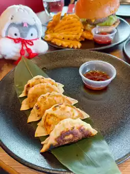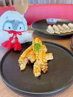 菜我点了名古屋鸡肉饺子和炸玉米骨❤️ 饺子炸得酥脆,蘸上特制的洋葱姜醋酱汁,超级美味✅ 玉米骨口感独特清爽,搭配甜椒酸奶酱汁,味道相当惊喜🤤
