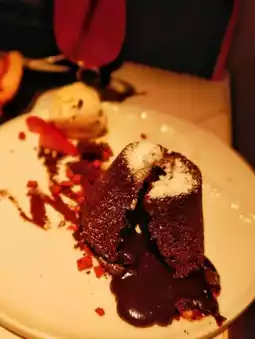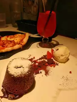 暖心甜点(港币 98 元):蛋糕外层略带酥脆,用叉子轻轻一戳,里面的黑巧克力熔岩便会缓缓流出。苦甜平衡恰到好处,香草冰淇淋冷热交融,堪称完美。🍹