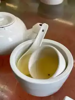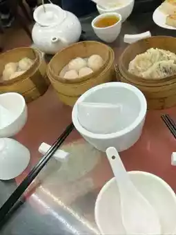→ 在香港本地点心餐厅,用餐前用开水清洗餐具是一种习俗。这是过去卫生状况不佳时留下的习惯,至今仍然保留着。具体来说,您需要将勺子和筷子放入一个小碗中,倒入开水,然后冲洗干净。之后,将茶杯在小碗中旋转清洗,最后冲洗小碗本身。清洗完毕后,将热水倒入桌上的大碗中。⑤