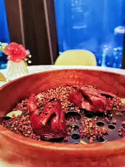 获奖菜品“赖埔金盒”绝对是名副其实的功夫名菜!外皮炸至酥脆,芋泥经过多次压制,格外蓬松顺滑。关键在于浓郁的黑松露酱汁冲击味蕾,一口咬下去,鲜香交织,极致享受! 🐦 “大红袍乳鸽”令人惊艳
