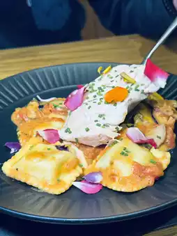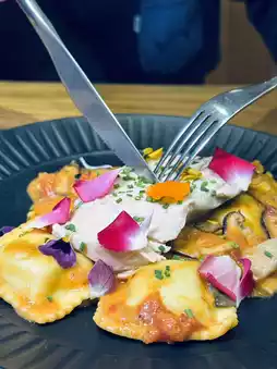 慢煮三文鱼鲜嫩多汁,香气扑鼻,馄饨外皮劲道,内馅是浓郁的牛肝菌。番茄泥芝士酱汁清新健康。