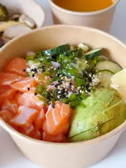 这次简直是健康饮食爱好者的天堂!这次我尝试了他们的“经典三文鱼盖饭”,一端上来就美得让人窒息🤩!橙红色的三文鱼铺满整个碗,搭配翠绿的牛油果、清爽的黄瓜,再加上葱花和芝麻,淋上自制酱汁,看起来超级诱人!三文鱼新鲜厚切,入口油润适中,佐以微酸的柠檬汁,一点也不油腻。寿司饭软硬适中,酱油略带甜味,和米饭简直绝配!戳破温泉蛋,蛋液拌入米饭和三文鱼中,味道完美融合。Poking