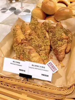 我去了附近的铜锣湾,走进皇家堡分店,发现有分店限定的开心果杏仁可颂,售价28港元,个头不小,开心果碎也很多,就是买一个🤣