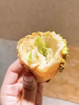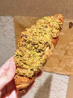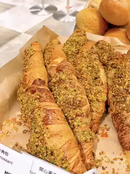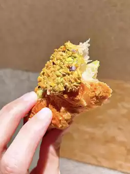 看起来挺帅的,可颂的酥皮烤得恰到好处,开心果碎覆盖了整个可颂表面,口感蓬松,只是里面的开心果酱少了点,光靠开心果碎的香味不够浓郁。📍