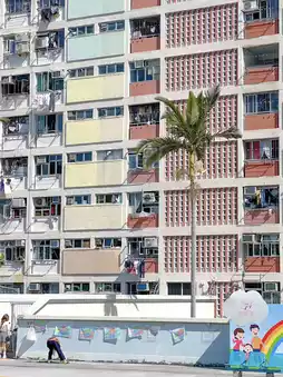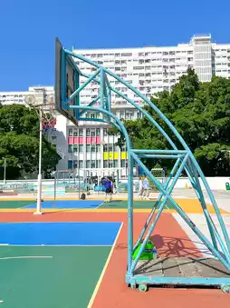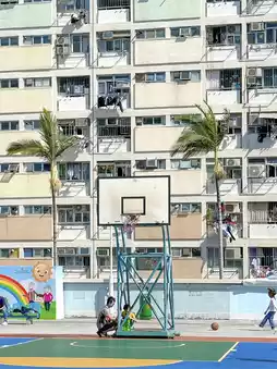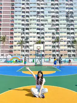 香港一处别致的篮球场,背景是粉彩色的建筑🌈